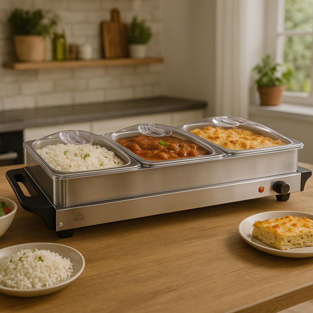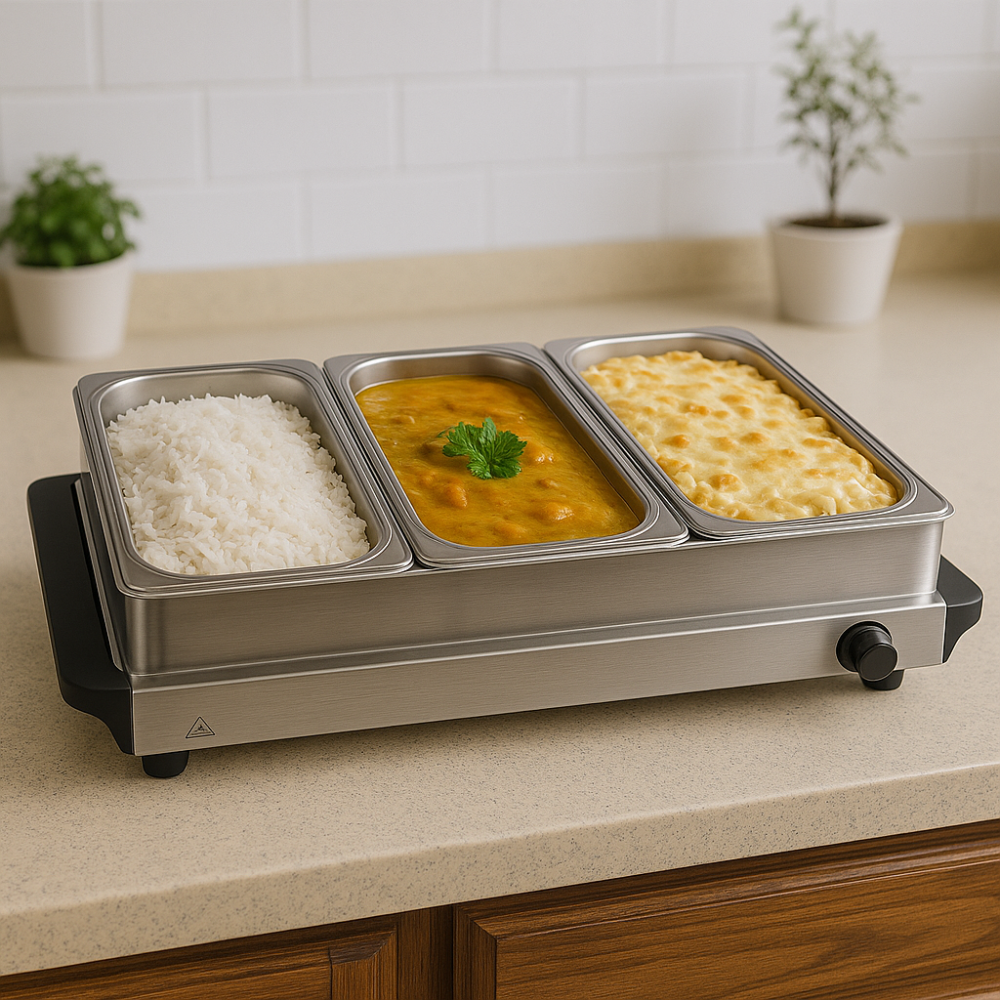 :استمتع بتقديم الطعام دائمًا ساخنًا ولذيذًا مع سخان الطعام الكهربائي بثلاثة أوعية من الستانلس ستيل.